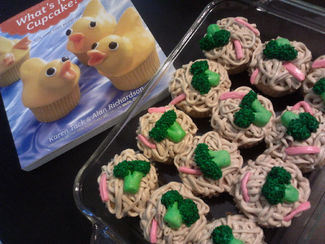 The dilemma started the next day when I had time to go to the local Michael's and peruse the books for my newly chosen favoritest cupcake book in the world. My book (Hello, Cupcake, What's New?) was not one book, but TWO books (Hello, Cupcake and What's New, Cupcake?). Woah. The Sam's Club version was half of one book and half of another. Decisions had to be made. One book was more than enough for a mommy of a toddler (at least for a month or two) I finally settled on the book with the lo mein cupcakes. I think it was the broccoli. Go figure, I'm not really a fan of broccoli, but this time it won my heart.